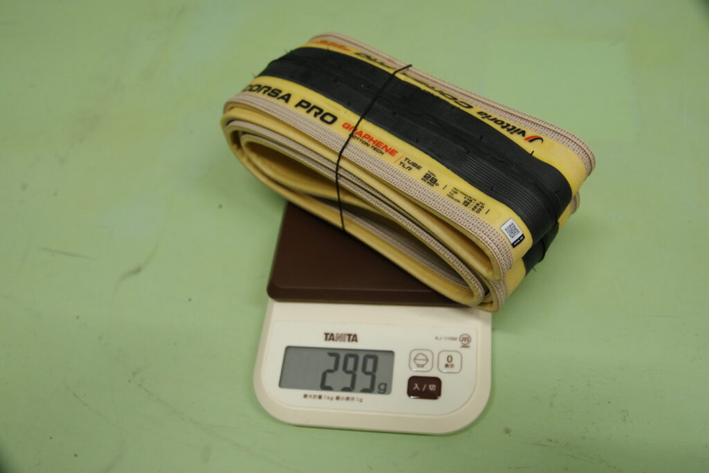 このタイヤは210gほどで軽量、とても優秀なタイヤです。トレーニングなどにはうってつけのタイヤだと思います。